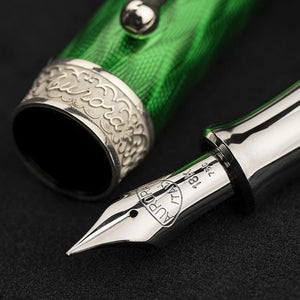 The Conte fountain pen is created using solid sterling silver (925) with a ‘flamé’ guilloche effect. The details are also created from sterling silver. The cap and barrel are coated in green glazed lacquer.